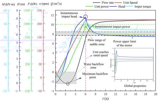 In order to explore the influence of rapid-drop gate opening speed on the start-up process characteristics of the LAPS, it was necessary to transiently simulate the start-up process of the LAPS with different gate opening speeds (gate opening and unit start-up synchronization). Figure 11 shows the variation law of the key characteristic parameters of the LAPS with time; the time required for gate opening was 120 s. It can be seen from Figure 11 that the fluid in the pump will be backflow at the initial stage of the start-up because the speed of the impeller has not been raised to the rated speed. With the gradual increase of the speed of the impeller, the phenomenon of backflow in the pump gradually disappears, and the pump head increases steadily. When t = 6 s, the unit reaches the rated speed, and the instantaneous impact head and instantaneous impact power (IIP) of the pump also reach the maximum. When the unit reaches the rated speed, the LAPS gradually transitions to the conventional steady operation, and the fluctuation of the key characteristic parameters tends to be smooth.