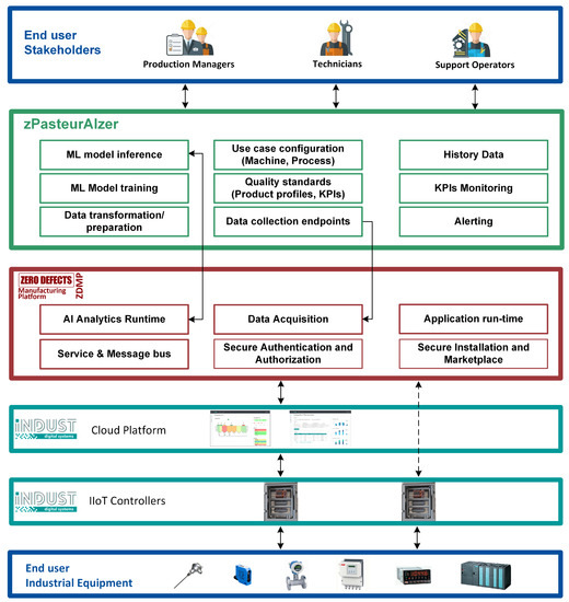 The design and implementation of zPasteurAIzer is based on a microservice-oriented architecture. Microservices are an architectural and organizational approach to software development in which software is composed of small independent services that communicate over well-defined APIs [36]. These services are owned by small self-contained teams. Microservices are used in this work, as they make applications easier to scale and faster to develop, and because the architecture and components of ZDMP are based on microservices. Figure 1 depicts the overall end-to-end architecture guiding zPasteurAIzer, while Figure 2 provides an overview of the ZDMP architecture. Starting from the bottom, the end-user industrial equipment (in our case, the temperature sensors and PLC signals) are connected to the IIoT controllers, which collect the data for forwarding to the centralized cloud platform and database.