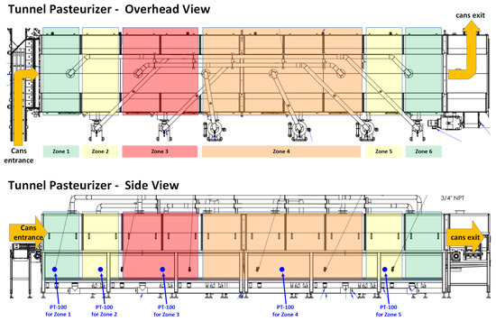 Tunnel pasteurization. The food and beverage industry relies heavily on pasteurization to ensure the safety and quality of their products. This process, which involves heating the product to a specific temperature for a specific duration, eliminates harmful microorganisms and preserves the physical stability and flavor of the product. In the case of beer manufacturing, the tunnel pasteurization process has been extensively studied in the past [1,2,3,4,5]. It involves filling cans or bottles with the produced beer and then passing them through a stainless-steel tunnel where hot water is sprayed onto the packages. The bottles or cans are then transported through the tunnel slowly on a conveyor belt or walking beam, passing through various temperature zones designed to bring the product up to pasteurization temperature, hold it there for a specified duration, and then bring it back down to room temperature. This process ensures the safety of the final product and preserves its taste and longevity, making it ready for consumption. Advanced tunnel pasteurization systems are equipped with complex control mechanisms that regulate the temperatures involved and handle any delays or slowdowns in the process to ensure the proper pasteurization of the product without over- or underprocessing it.