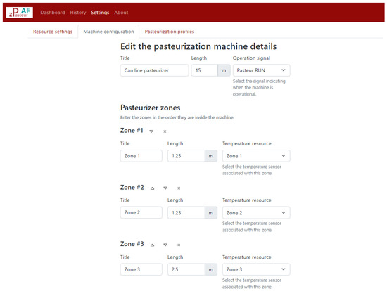 In the second settings tab (Figure 5) the user provides basic details concerning the pasteurization machine, such as the name of the machine, the length of the tunnel in meters, and the process signal that states when the conveyor belt of the machine is moving (the RUN/STOP status of the machine). Then, the user has to set the different thermal zones of the machine. For each zone, the user has to provide its name and length in meters, then select the sensor that monitors the temperature in that zone. The user can delete or reorder zones using the corresponding buttons next to the zone names.
