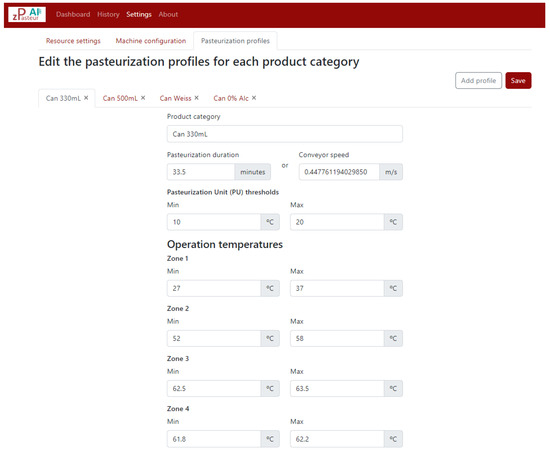 Finally, in the Pasteurization Profiles tab (Figure 6), the user can set production quality standards for each product or family of products. For each product category, the user provides (a) the name of the category and (b) the duration of pasteurization (in minutes) for a product of this category or the associated conveyor belt speed. As the length of the tunnel is set in the machine configuration tab, when the user provides one of the last two setting values the other is automatically calculated. Then, the user provides the lower and upper PU limits that are accepted for products of this category according to the quality standards. This is the most critical parameter of the pasteurization process monitored by the system. Finally, for each zone, the user sets the lower and upper limits of the operating temperatures.