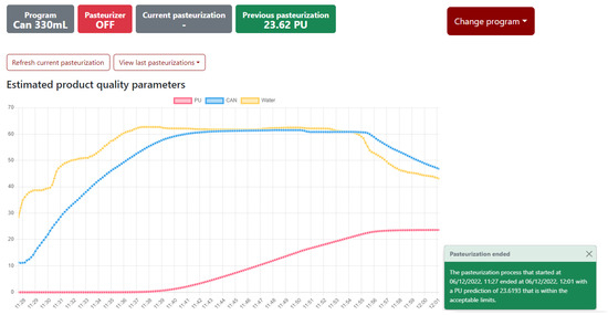 Using the “Refresh Current Pasteurization” button, the user can sync all the measurements and estimated values up to the latest time of the current pasteurization. As mentioned in Section 3.3, the sampling frequency for the zone temperatures and the predictions of the ML models for the temperature estimations is set to every 10 s. The “View Last Pasteurization” button provides operators with the ability to view the respective temperatures and estimations for the previous batch of pasteurized products, allowing them to visually inspect the trend and determine whether the process response is normal.