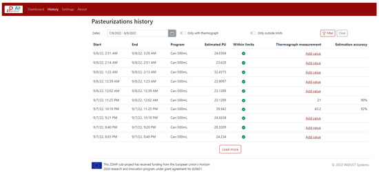 - History: this page contains a detailed history of all pasteurization runs and the ML-driven estimations of their respective process parameters. The operator is able to filter the data according to predefined criteria, and most importantly, to input the recorded values from the thermograph recorder for the accumulated PUs of a specific pasteurization in order to perform validation.