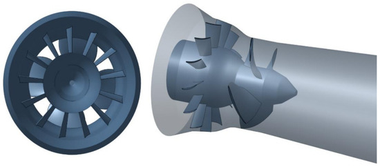 where is the torque, and is the term related to lost tangential kinetic energy at draft tube outlet. In order to make possible the turbine flow rate regulation, the above-described propeller turbine (single point operating turbine) has been modified by introducing regulating guide vanes (Figure 2) and the possibility of electronic control of the rotational speed in proportion to the flow rate variations. The shape of the meridional channel was kept unchanged, but it was necessary to axially extend the initial cylindrical part of the channel to house the two stator rows.