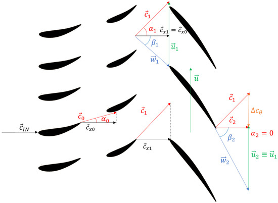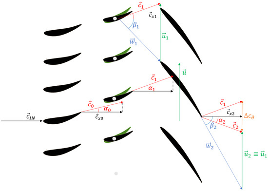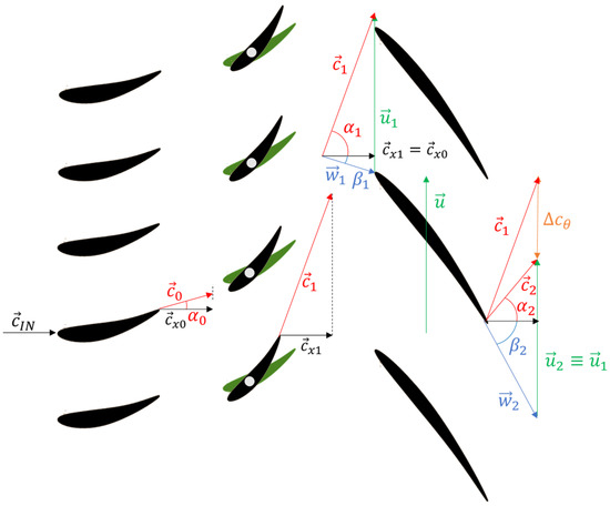 Guide vane and rotor blade profiles in the meanline blade-to-blade plane and flow velocity triangles at off-design conditions (, simple guide vane regulation)—flow rate reduced.