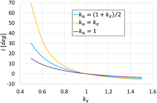 It is interesting to note how the values of the incidence angle are of limited entity and negative for values of greater than unity. On the contrary, for low values of , the incidence angle shows a strong increase, mostly for .