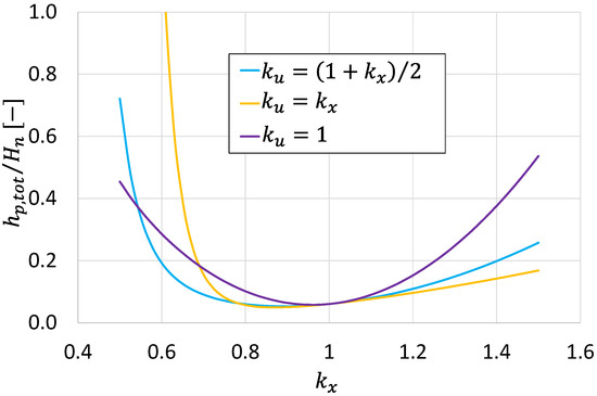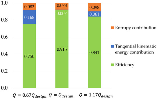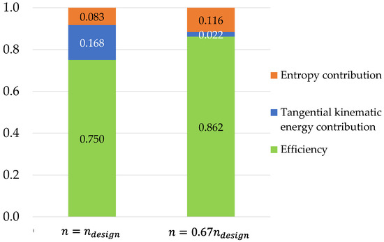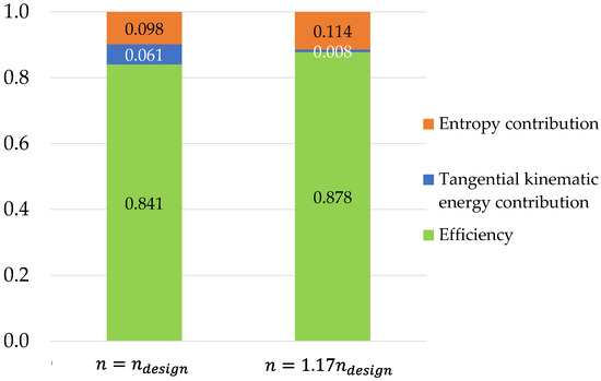 Similarly, Figure 20 shows the comparison of loss contributions and efficiency for two different rotational speeds at . Additionally, at this flow rate, the proper variation (in this case the increase) of the rotation speed leads to a considerable decrease in the normalized tangential kinetic energy loss contribution, which corresponds to an increase in efficiency.