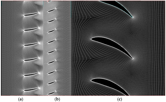 Blade-to-blade mesh for stay vanes (a), guide vanes (b), and rotor blades (c).