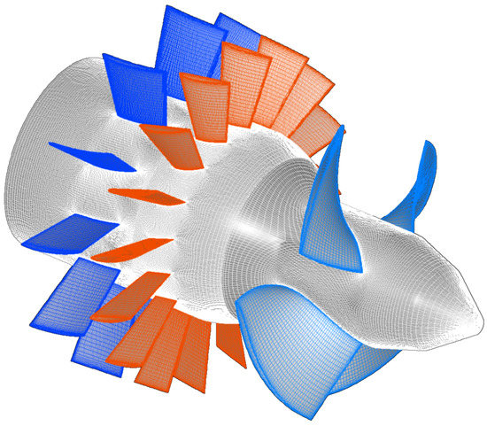 Similarly to the 3D turbine design analyses reported in [7,8], the definition of the turbine geometry was carried out through the generation of a file defining the geometry of the turbine meridional channel and the coordinates of the three blade rows constituting the turbine (stay vanes, guide vanes, and rotor). However, differently from the above references, since in the present study different operating conditions and thus different distributor geometries need to be simulated, the shape of the guide vane row was managed by means of a simple calculation software capable of providing the position of the points that define the guide vane row once the correct stagger angle was defined and imposed by the operating condition of the turbine.