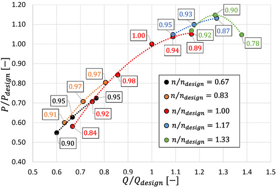 For , the rotational speed is not varied with respect to the design condition; this condition represents the simple guide vane regulation. If = , a strict proportionality between the axial velocity component and blade velocity is established via the frequency electronic regulator that completely suppresses the tangential velocity component at the rotor exit induced by the off-design conditions in case of constant rotational speed , but unfortunately enhances incidence angle variation at the rotor blade inlet. An intermediate regulation strategy with , is also considered.