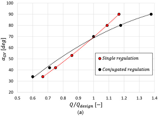 As a further analysis step of the CFD results, Figure 15a shows the guide vane opening angle laws as a function of the fraction of the design flow rate for the case with only guide vane regulation and for the case with combined guide vane opening angle and rotational speed variation, having considered, for this latter case, the points corresponding to the efficiency envelope curve. An important advantage of the combined control strategy is the significant reduction, especially at large flow rates, of the guide vane opening angle variation required to obtain the desired flow rate variation with respect to the single guide vane regulation. Figure 15b reports, as the final step of this analysis of the CFD results, the conjugation curve of the two regulation parameters, i.e., the guide vane opening in function of the rotational speed variation, that allows the flow rate variation with the optimum efficiency conditions.