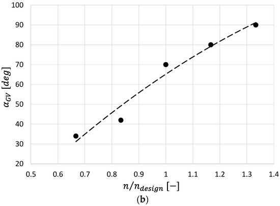 is the Ainley–Mathieson profile loss coefficient at design condition, evaluated as 0.03 from Figure 4 of the Ainley–Mathieson paper, and is the incidence angle coefficient calculated with a grade 6 polynomial fitting the curve of Figure 6 of the same paper. Figure 8 shows the trends of the angles of incidence deduced from the 1D meanline analysis for the various regulation strategies.