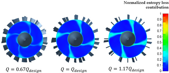 Normalized entropy loss contribution at a design rotational speed for three different flow rates at design rotational speed—.