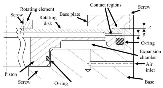 To actuate the clamping, the pressurized air is pumped into the expansion chamber through an inlet. Two O-rings are used to prevent fluid leakage. As can be observed in Figure 1, the piston is fixed to the basement by the screws shown in Figure 2. These screws prevent piston scrolling. Clamping is achieved through piston deformation: Air pressure leads to the elastic deformation of the piston, which bends until it touches the peripheral region of the rotating disk. The force applied by the piston’s upper surface determines a deflection of the disk, which goes in contact with the fixed plate. It is worth remarking that clamping takes place when the rotating disk is stationary, i.e., there is no relative angular sliding contact between the parts. The friction generated between the piston and the disk and between the disk and the base plate determines a clamping torque , which can be estimated as in Equation (1)