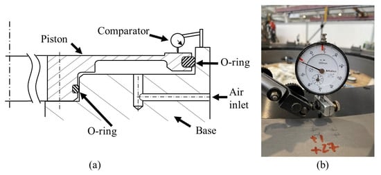 The axial displacement of the piston is evaluated by means of a dial gauge fixed to the machine base. A schematic representation of the experimental setup is shown in Figure 4a, while Figure 4b shows a picture of the real tests.