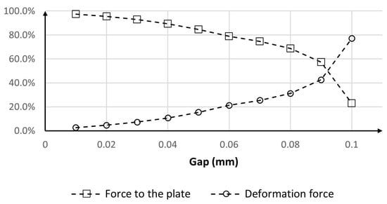 As previously described, the role of the piston is to deform the disk and put it in contact with the base plate. The force generated between the disk and the base plate is then responsible for the clamping torque acting on the system. Therefore, the difference between the force applied by the piston on the disk and that applied by the disk on the base plate consists in the force necessary to deform the disk. To better understand the effect of the gap on this dissipation, Figure 5 plots the percentage of the piston-disk force used for braking and deforming the disk. As it can be seen, in the case of a 0.01 mm gap the force applied to the disk by the piston is almost entirely transmitted to the plate, with a loss of around 2.6%. On the other hand, in the case of a 0.1 mm gap, 77% of the force is spent to deform the disk before touching the base plate.