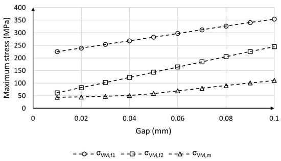 As mentioned in Section 2.2, the finite element model is used to calculate the maximum stress on the piston considering an internal pressure of 6 bar. Specifically, the equivalent von Mises stress is investigated. Figure 6 plots the peak values of equivalent stress and acting on the first and second fillets, respectively, at p = 6 bar. The maximum equivalent stress on the piston membrane, namely the region of the piston with thickness t (see Figure 2), is also reported. It is possible to notice that the stresses on the two fillets increase linearly with the gap but with different slopes. Particularly, a more severe effect of the gap on the peak stress on fillet 2 can be observed. The maximum stress on the membrane presents a non-linear dependency on the gap. It is possible to observe that this value is always lower than those calculated on the fillets due to the effect of stress concentration.