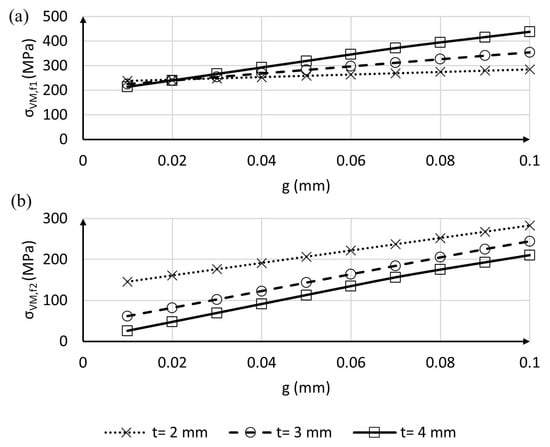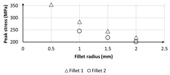 For the scope of this study, the radii have been augmented up to 2 mm with steps of 0.5 mm. Figure 8 shows the corresponding decrease in stresses calculated at g = 0.1 mm. As can be seen, an abrupt drop of the peak stress can be observed moving from 0.5 mm to 1 mm on fillet 1. For higher dimensions, both fillets show a linear reduction of the maximum stress.