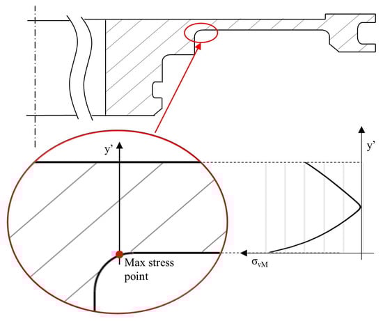 Due to the complexity of geometry and stress distribution, it is not possible to define a fatigue stress concentration factor according to traditional calculation methods [24]. The corrected stress is thus estimated starting from the results of the static FEA [25,26]. Specifically, the Support Factor method is used [27]. This approach requires the calculation of the equivalent stress distribution in the direction normal to the maximum stress point (i.e., the direction shown in Figure 9). The gradient of the stress function at the maximum stress point, named , is thus expressed by Equation (5):