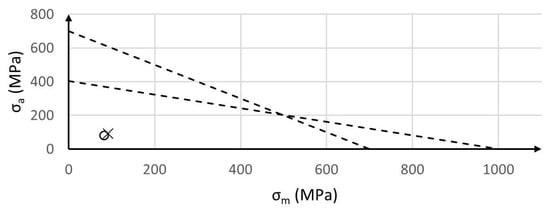 Considering that the UTS of the 40CrMnMoS86 is equal to 1000 MPa, Equation (3) leads to = 315 MPa. The load varies between 0 and the peak value, so the fatigue limit on the stress amplitude () and medium stress () can be calculated as in Equation (4):