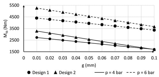 As mentioned, the actual gaps between rotating and fixed elements suffer from uncertainties due to manufacturing and assembly errors. Therefore, it is useful to report here the operating points of the system at different values of g. Figure 11 plots the clamping torque as a function of the gap g. As discussed in the previous sections, the two designs lead to similar values of when g = 0.1 mm and p = 6 bar. Nonetheless, different trends can be observed when varying g. Particularly, design 2 allows for achieving higher torque in the case of small gaps. The difference between the two designs becomes more evident in the case of higher pressure, i.e., p = 6 bar.