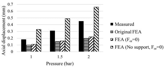 Firstly, simulations have been replicated excluding the resistant force acting on the support, i.e., assuming a frictionless contact between the O-ring and the structure. The results showed that the increase in vertical displacement is negligible and does not fill the gap with experimental observations. On the other hand, if the effect of the O-ring is ignored, i.e., the frictionless support is removed, and no resistant force is applied the results of FEA exceed the experimental observations, as shown in Figure 13.