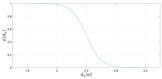 where are smooth distance-based switching functions which satisfy that for and for . This allows us to turn on/off the collision avoidance mechanism. is the distance between the i-th and the j-th agents. For designing this control law, every agent considers that there exists an unstable focus structure centred at the position of any other agent which ensures that the agents repel each other. The repulsive vector fields, which are given by the second right-hand term in (36), are designed by taking into consideration the relative positions between any pair of robots, when they are in their sensing regions. The relative position variables are defined as