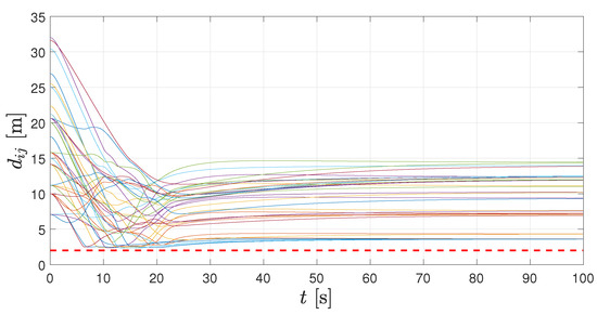 In Figure 6, Figure 7 and Figure 8, we show the results up to the first 100 s of simulation. In Figure 6, the distances among any pair of agents are depicted. There, a horizontal dashed line represents the minimum allowed distance between them. Clearly, no pair of robot get closer than this predefined bound and, even more, the conflict among agents are solved after about 30 s.