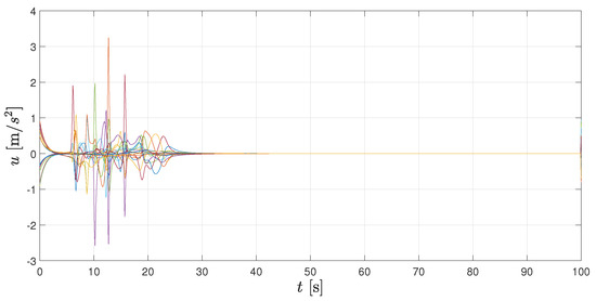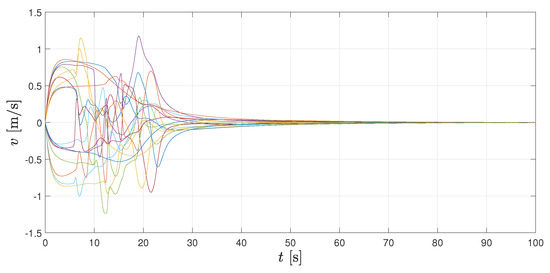 Additionally, in Figure 7 and Figure 8, velocity and control signals are illustrated, respectively. As it can be seen, velocities tend to zero, which implies that the whole formation stays at its current location once the geometrical pattern is reached. Both velocities and accelerations remain bounded during the transient period. Figure 9 shows the spatial configuration of agents at different times, which helps to illustrate the convergence to the desired formation.