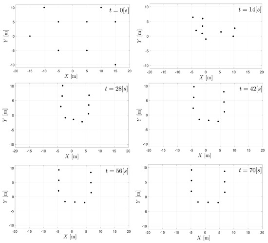 with and . This exhibits the behaviour depicted in Figure 5 and gives a good approximation to the properties of the switching functions defined previously. The minimum distance between agents one they reach the desired formations is about 3.5 m. This distance ensures these patterns are reachable. The parameters of the simulation are summarized in Table 1.