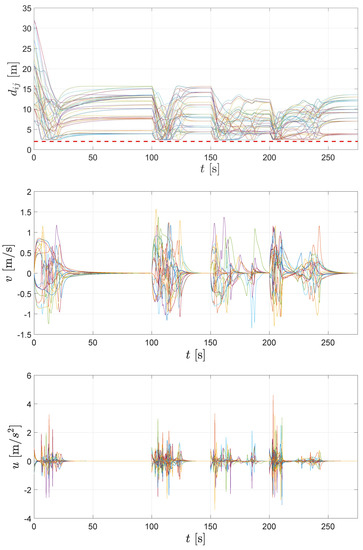 In Figure 10, distances between agents, velocities and accelerations are depicted for the whole simulation time. Details about time evolution can be appreciated more clearly in the video attached as Supplementary Materials.