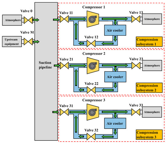 To verify the reliability of the MDSG model, an industrial air suction parallel compression simulation system is developed. Figure 2 shows the structure of the air suction compression system in detail. The system is connected to the upstream equipment for venting, which consists of three compressor subsystems, a suction pipeline, and valves. The green arrow in the figure represents the flow direction of air in the system during normal operation, where the exhaust gas is discharged into the atmosphere from the upstream equipment under the work of the parallel compression system. The compression subsystem has the same structure and operates in parallel as required. Valve 0 connects with the atmosphere to control the pressure in the suction pipeline. Moreover, detectors for pressure and temperature are installed at the inlet and outlet of each compressor.