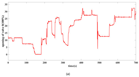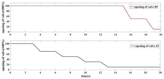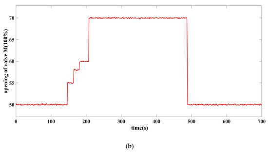 The pressure and temperature measured in the experiment of upstream equipment are used as the dynamic boundary condition for valve M. The valve opening recorded in the actual process is used as the input instruction of each valve in the simulation. The opening of valves 11, 21, 31, 13, 23, and 33 is 100%, and the opening of the recirculation valve 12, 22, and 32 is constantly 0% during the 700 s of the working condition, which results in a compressor recirculation mass flow rate of 0 for the three subsystems. The opening of valve 0 and valve M is shown in Figure 4.
