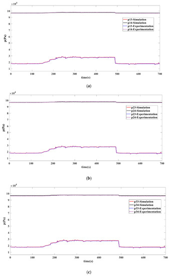 Comparison of simulation and experimental results on compressor pressure. (a) Results of compression subsystem 1, (b) results of compression subsystem 2, (c) results of compression subsystem 3.
