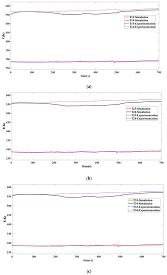 Comparison of simulation and experimental results on compressor temperature. (a) Results of compression subsystem 1, (b) results of compression subsystem 2, (c) results of compression subsystem 3.