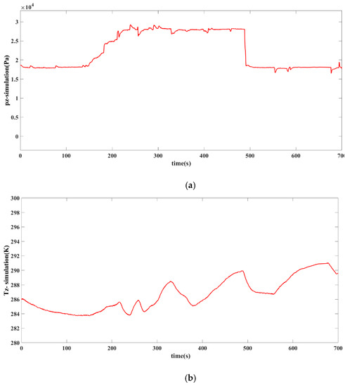 Figure 7 shows the simulation results of the pressure and temperature of the suction pipeline. In this working condition, the parallel compression system downstream of the suction pipeline keeps a constant working state. The pressure and temperature change with the opening of valve 0 and valve M. The exhaust gas of the upstream equipment of valve M has a great influence on the suction pipe pressure. Valve 0 is connected with the atmosphere as a regulating valve, and its influence is relatively weak. Valve M gradually opens from 0.5 to 0.7 between 146 and 209 s as suction pipeline pressure pz gradually increases, where the stage of pressure rise corresponds to the step change of the opening of valve M during this period. At 487 s, valve M closed from 0.7 to 0.5, resulting in a decrease in pz. The pressure fluctuation of pz in each stage is mainly caused by the change of opening of valve 0. The temperature of the suction valve varies within 6 K and is affected by the exhaust gas temperature of the upstream equipment. Qualitatively, the simulation results of the suction pipeline are consistent with the actual situation.