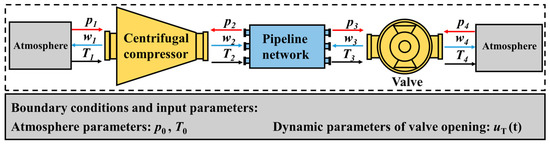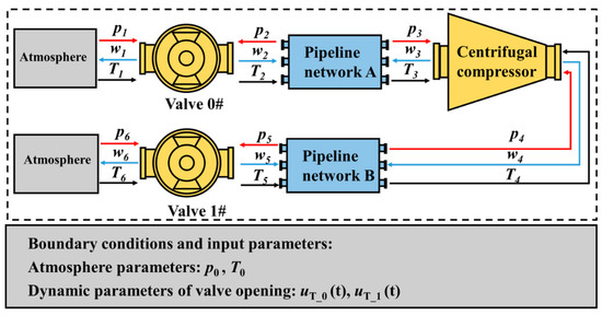 A Greitzer model usually consists of the compressor, rear cavity, and downstream valve. The three parts are regarded as a system to describe the principle of surge. In the MDSG model, the compressor, pipe network, and valves are taken as independent dynamic simulation modules, which can not only set the characteristic parameters of target components specifically, improving the simulation accuracy, but also conform to the actual structure of the actual complex system. The component modules are divided into two categories. One includes compressors and valves with input parameters of upstream and downstream pressure and output parameters of mass flow rate. The other includes the pipe network, whose input parameter is the mass flow of each pipe network interface, and the output value is the pressure of each interface. The two modules appear alternately to realize the system simulation. The mathematical equations for each component are given in turn below.