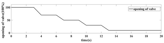 The MDSG model is used to simulate the compression system with one throttle valve, which includes a compressor, a pipeline, and a throttle valve. As with common compressor performance testing systems, the compressor intake is exposed to the atmosphere. A long and straight round pipe is installed at the downstream outlet of the compressor, connecting with a butterfly valve on the other side. The butterfly valve will discharge the gas from the compressor to the atmosphere. In the MDSG model, compressors, valves, and pipes are treated as separate lumped parameter components. The schematic diagram of the modeling and a serial number of the connecting surface of each component are also shown in Figure 9. The prototype of the compressor module is a centrifugal compressor with a design mass flow of 2.7 kg/s. According to the geometric dimensions of the compressor, Lc = 0.317 m, and Ac = 0.0471 m2. The pipeline is straight, with a length of 1.5 m and a pipe diameter of 0.2 m. The throttle is a butterfly valve with a diameter of 0.2 m. The upstream and downstream boundaries are both atmospheres, where pressure p0 and temperature T0 are 97,600 Pa and 290 K, respectively. The dynamic parameter of valve opening uT(t) from outside input is shown in Figure 10. To simulate the physical opening behavior of the valve, the valve opening is a linear variable. The initial pressure of the pipeline is set as atmospheric pressure, and the initial mass of the compressor is a minimal disturbance. The time step of the simulation is a variable step in which the max step is 0.01 s and the min is 10−6 s, and the relative tolerance of the simulation value is 10−3.