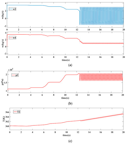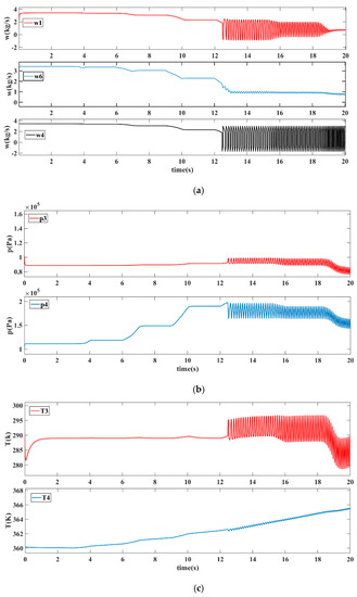 Mass flow (a), pressure (b), and temperature (c) of the compression system with one throttle valve in surge condition.