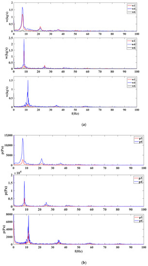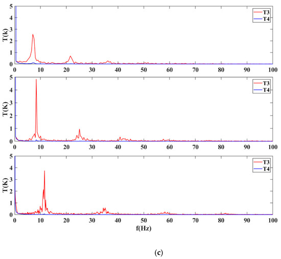 From t = 15 s to t = 20 s, uT_0 is reduced from 100% to 10%. Under the condition of the surge, as valve 0# is continuously regulated, we can observe that the vibration amplitude of w1 decreases, and the vibration amplitude of p3 increases with the decrease in uT_0. As valve 0# is closed, the resistance of gas entering pipe network A increases. Therefore, the impact of the surge is reflected in the increase in pressure fluctuation and the decrease in average pressure in pipe network A. From the figures, we can also observe that the vibration amplitude and mean pressure of p4 decrease with the closing of valve 0#. For the compression system, a smaller uT_0 means that the mass flow into the system is smaller and the load on the entire compressor system is lower. There is a similar experience in the actual industrial site; the upstream valve of the compressor is more easily affected by the adjustment of the compressor power, while the downstream valve has a greater impact on the migration of the operation point. The results also show that the temperature trend is consistent with the pressure. Because T3 is similar to T0 in pipe network A, there is less heat transfer on the pipe wall in front of the compressor. Therefore, there is no obvious trend in the average temperature of T3 except for the dynamic changes caused by pressure fluctuations. T4 tends to rise because the compressor effect and the heat transfer balance take longer to reach. Finally, the vibration frequency of the compressor surge increases as the inlet valve 0# is turned down. According to the dynamic changes of parameters during the surge, it can be observed that the vibration frequency of mass flow is different among t = 13–15 s, t = 15–18 s, and t = 18–20 s. The frequency characteristics of pressure, temperature, and flow under surge conditions in the above three periods are obtained by FFT, as shown in Figure 17. It can be observed from the figure that valve 0# will cause a change in the surge frequency of the compressor system. From 13 to 15 s, valve 0# is 100% open. From 16 to 18 s and 19 to 20 s, the opening of valve 0# is 50% and 10%, respectively. With the decrease in the opening of the inlet valve, the frequency of the compression system increases. In addition, for the surge in the same period, the vibration frequencies of mass flow, pressure, and temperature are the same. The increase in surge frequency is caused by the decrease in mass flow of the system when closing the inlet valve, and the main frequency of surge changes with the opening of the inlet valve.