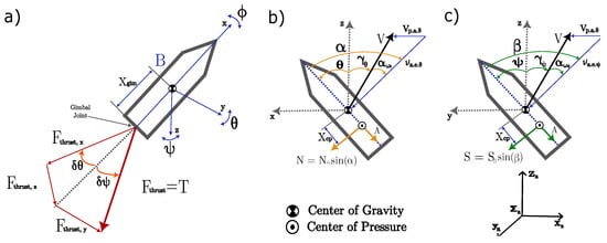 where is the rocket mass, are the aerodynamic forces, is the thrust force, and is the gravity force, with the rotation matrix between the reference frames B and R, see Figure 4a. Note that the thrust and aerodynamic forces are defined with respect to the body reference frame B. In contrast, the gravity force is defined with respect to the inertial reference frame R.