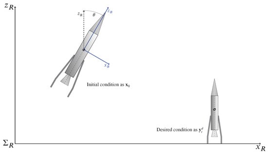 Consider that the rocket landing is performed on the vertical plane ; thus, the angles and and their derivatives are omitted. Additionally, the slip S in this direction is zero so let the nozzle control be zero. In this way, the rocket model becomes