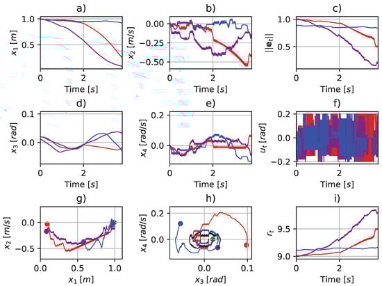 Comparative results for landing a rocket: classical box method CBM1 (blue), variable box method VBM1 (red), and VBM2 (purple), where the purple and black dots represent the initial and desired conditions, respectively. Subfigures depict the following: (a,b,d,e) show the rocket descending phase, for height velocity , angle , and angle velocity remain bounded while tracking errors remain near zero; (a) shows the better performance of our proposal, (c) shows how the error norm decreases while the reward increases (i), the control signal performance is show in (f), and phase portraits are show in (g,h).