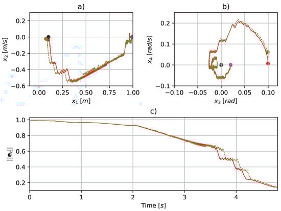 Consider the rocket subject to a Gaussian disturbance such that for , , and . Figure 7 shows the performance of the rocket landing with and without perturbations using the policy of the VBM1 case defined in Section 4.5. The initial conditions were . Figure 7a,b show the rocket’s portrait phase reaching the goal. Figure 7c shows the convergence under the previous learning process conditions, which were sufficient to compensate for disturbances that were unknown a priori.