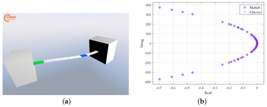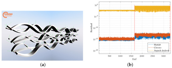 For the undamped case, as in (20), the value of in the shift–invert procedure is assigned as a small positive real value (by default, we used in our tests) in order to return the lowest eigenmodes, including those with zero eigenvalues in case there are rigid body modes. A small negative real value would work as well, but the numerical conditioning of the problem would be worse. If one needs specific eigenmodes clustered about some specific frequency , we set it as . For the damped case, we use a complex shift , with a small real value and no imaginary part if we are interested in the lowest eigenvalues, for instance, , or with a finite imaginary part if we need eigenmodes clustered about an frequency: .
