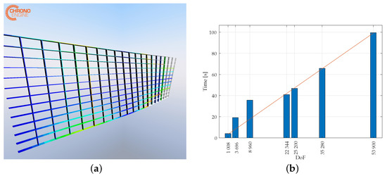 The scalability of the method was tested against a grid of Euler beams, whose size and number of cells are parametrized in order to provide different scales to the same problem. Each beam is fixed at every intersection with the grid. For each test, the lower 100 modes were computed. The number of elements are three and two, respectively, along each cell in the longitudinal and vertical direction. The ratio between the longitudinal and vertical number of cells is kept constant across the different tests. The results basically show a linear relation (