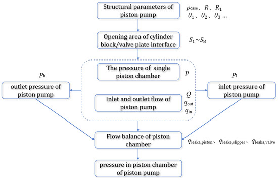 The solution steps of the pressure fluctuation model of the piston chamber are presented in Figure 7. It can be divided into three steps: Firstly, based on the sectional flow area S of the cylinder block/valve plate interface, the pressure of the piston chamber without considering flow ripple at the inlet and outlet of the piston pump is solved. Then, based on the obtained pressure, the inlet and outlet pressures ph and pl of the piston pump are solved through the inlet and outlet flow model. Finally, based on the inlet and outlet pressure of the piston pump, the flow entering/exiting through the distribution port, the leakage flow qleak,valve of the cylinder block/valve plate interface, the leakage flow qleak,piston of the piston/cylinder interface and the leakage flow qleak,slipper of the slipper/swash plate interface are calculated, and then the pressure of the piston chamber considering the flow ripple at the inlet and outlet of the piston pump is solved. In this study, the algorithm was programmed in Matlab. A 12 GB RAM computer with an Intel i7-9750H @2.60GHz processor was employed for the simulation.
