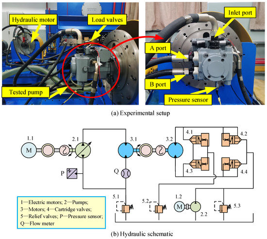 In order to verify the numerical model, a swashplate-type piston pump was tested in a closed-circuit hydraulic system shown in Figure 8. The measured parameters of the piston pump are shown in Table 2. The piston pump, produced by Hytek Hydraulic, is driven by a 75 kW variable frequency motor, and its rotational speed can be regulated from 0 to 1500 r/min.