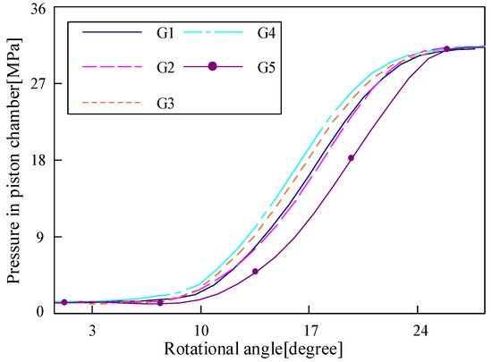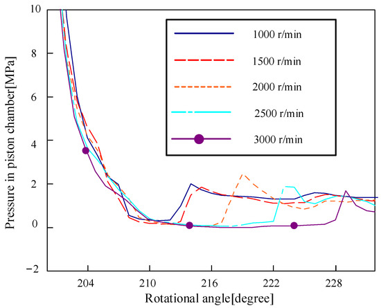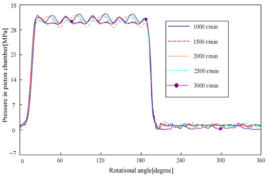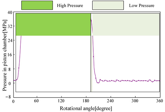 The pressure fluctuation curve of the piston chamber can be obtained by the numerical model, as shown in Figure 11.