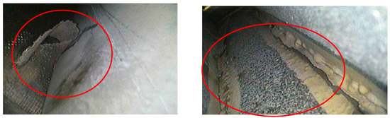 Every EM has to face thermal, electrical, ambient, and mechanical (TEAM) stresses during its operation and lifetime. Electrical stresses and especially PDs are the faults that most stress the stator winding insulation of a generator [13]. The following figures, which were taken during visual inspection using a borescope, show the stator of a real SG in Greece and the results of corrosion occurrence due to PD activity and electrical stresses.